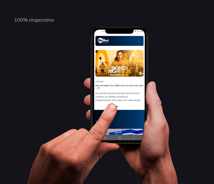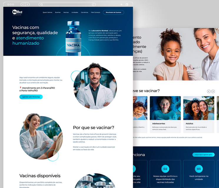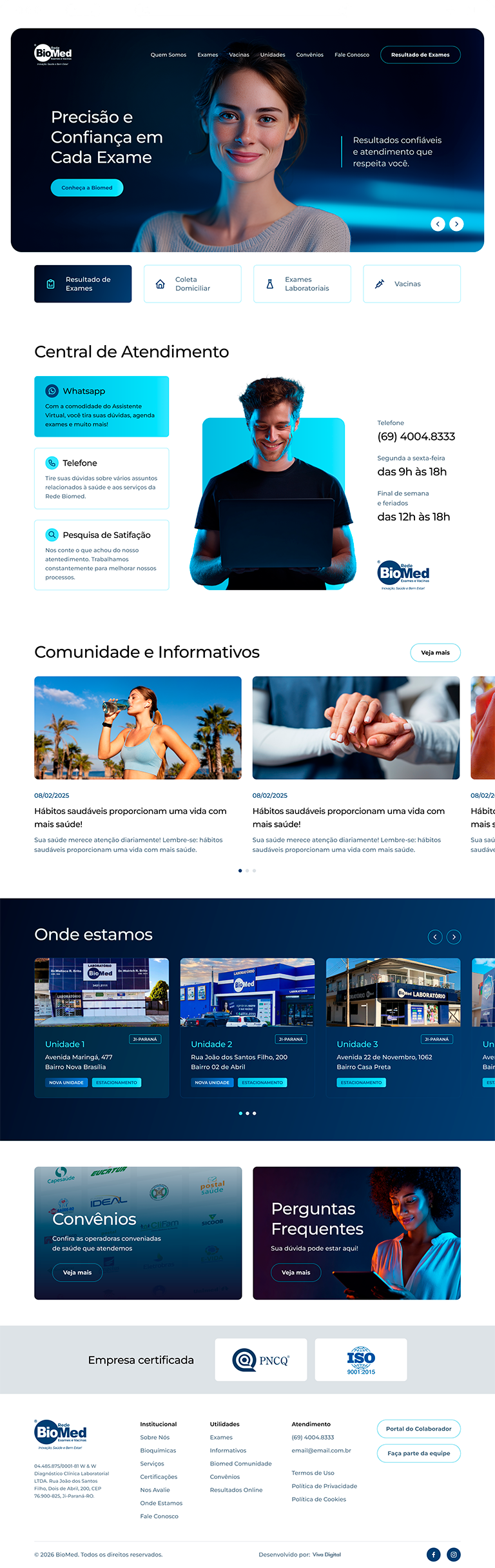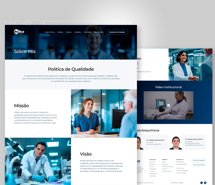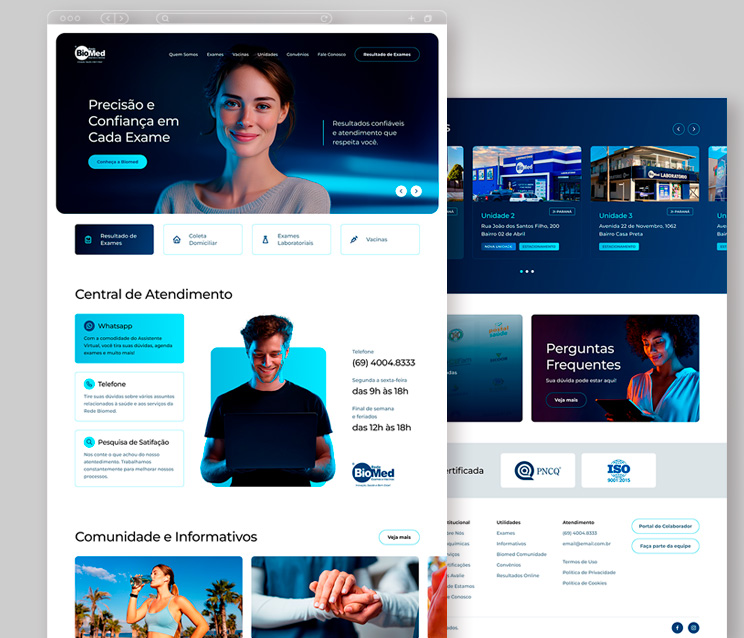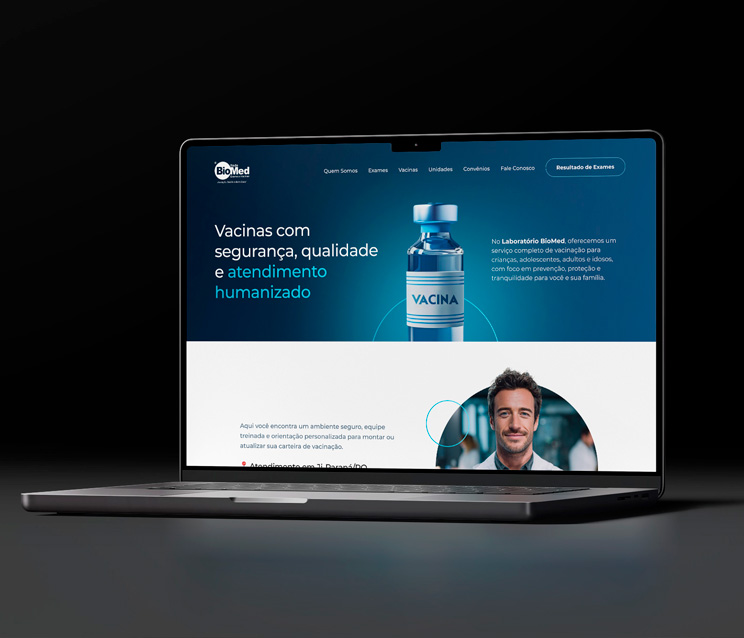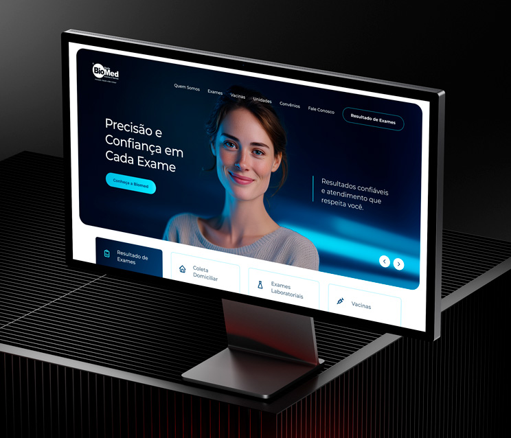 Desenvolvimento do site para Rede Biomed. O layout do website segue a identidade visual da marca, explorando os tons de azul dando sobriedade e transmitindo segurança e seriedade. O design, moderno e diferenciado, foi todo elaborado baseado nas seções mais acessadas no site anterior e trazendo as informações mais relevante aos visitantes de forma clara e acessível. Em matéria de funcionalidades, o site conta com notícias, unidades, perguntas frequentes divididas em categorias, lista de todos os exames realizados pela Rede, área especial de informações sobre vacinas e procedimentos dentr outras informações importantes aos clientes. Também possui integração de sistemas para os Resultados de Exame.
